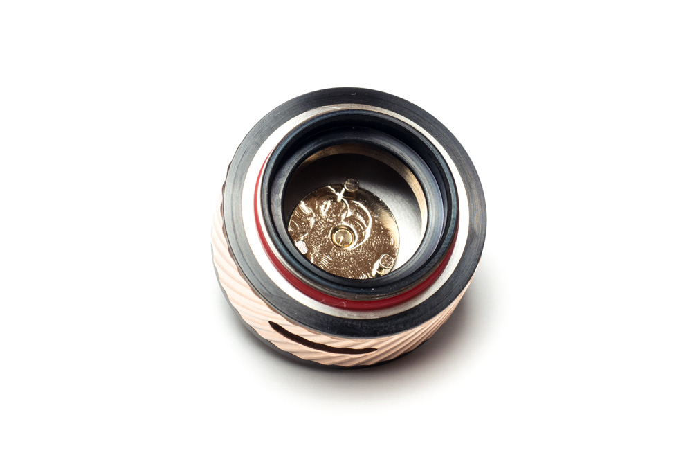 ベース部分。510接点部のポジティブネジで下からちゃんと留まっているタイプです。クリアロではフローティングになっているタイプも多いですが、これは安定感があって良いですね。良く見ると3本の柱のようなものが立っています。中のポジティブ部のプレートがとても変わった形をしています。これはコイルを見て頂けると分かるのですが、