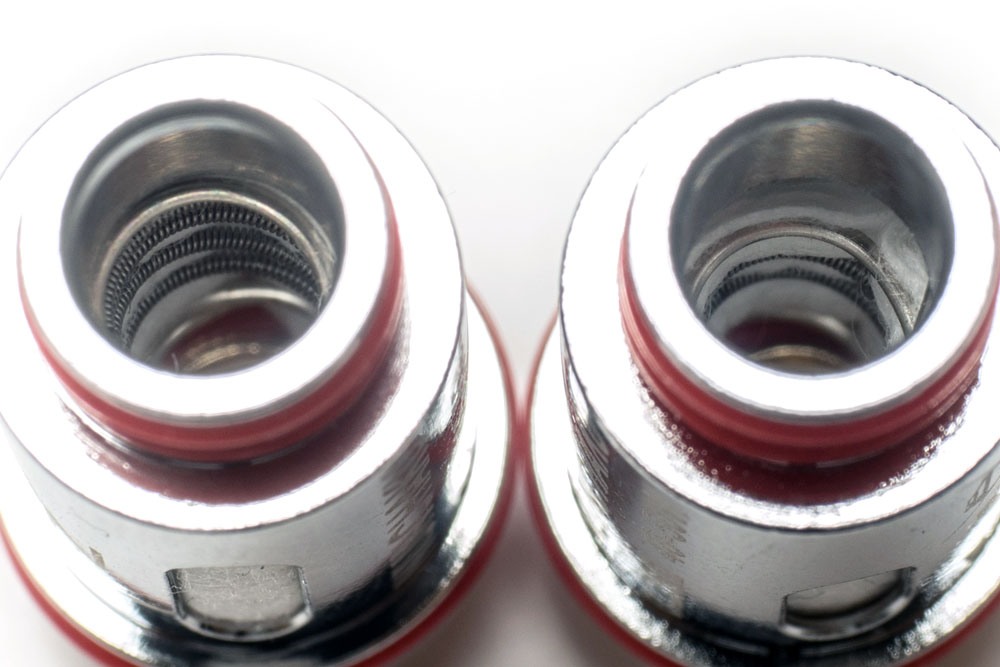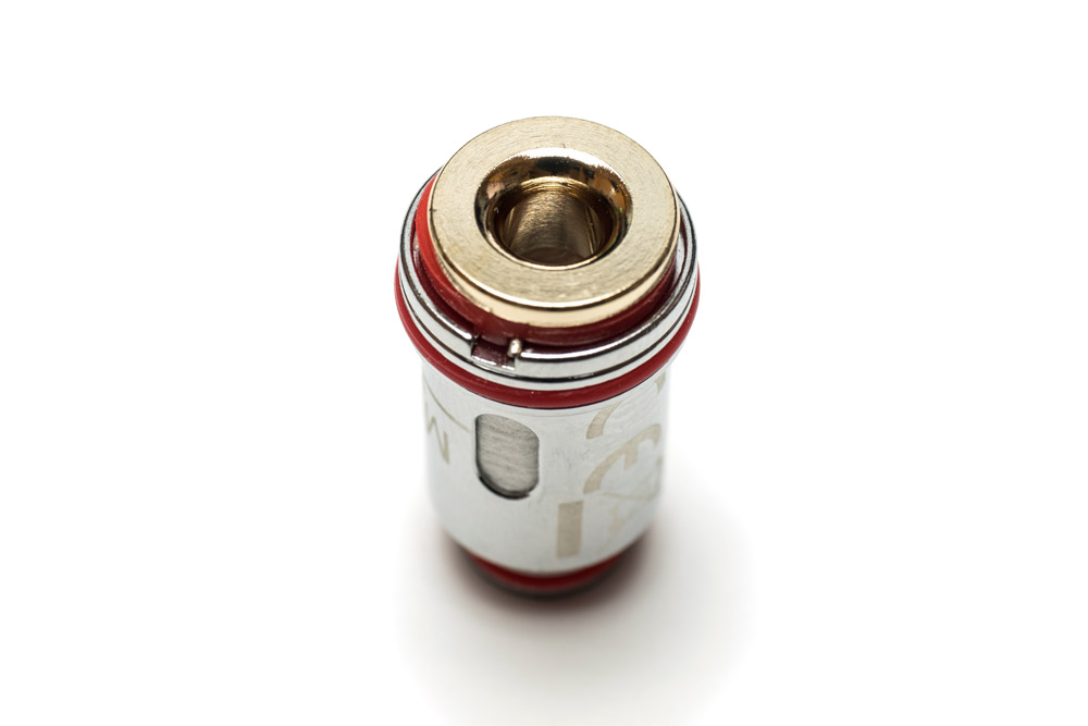 コイルの底面がこんな形になってるんです!丸くどかーんとファンネル状にエアホールになっていて、周りがポジティブの接点になっています。これは賢いなぁ・・・。実際、喫ってみるとかなり空気の通りがスムーズで、すごく工夫されている部分だと思います。